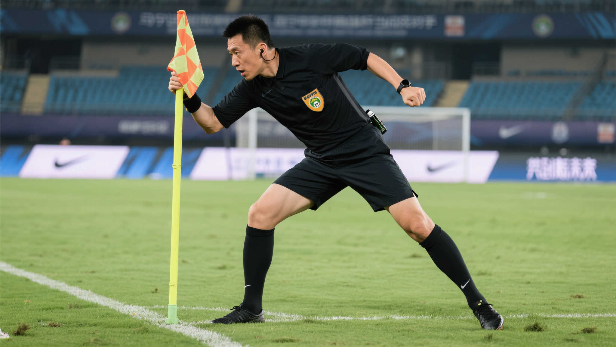 马宁赛前检查角旗杆,独特大臂一甩动作引关注